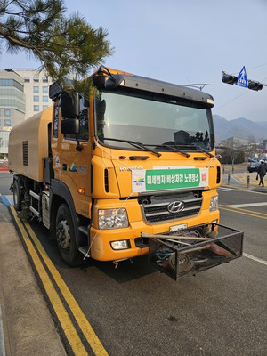 [충남타임즈] 초미세먼지 재난 위기경보 발령에 따라 예산군의 미세먼지 비상저감 노면청소차가 도로를 청소하고 있다. 예산군은 대기배출사업장 및 건설공사장 조업을 단축하고 자동차 배출가스 5등급 차량의 운행을 제한한다고 밝혔다.
