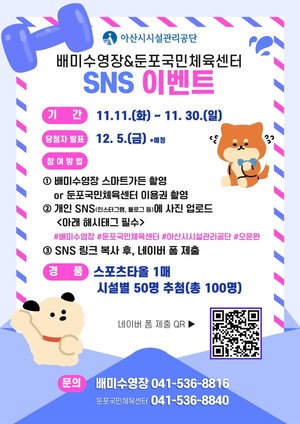 [충남타임즈] 아산시시설관리공단이 시민들의 일상 속 운동 문화를 넓히기 위한 참여형 이벤트를 마련했다. 공단은 11월 11일부터 30일까지 배미수영장과 둔포국민체육센터에서 사진 인증을 기반으로 한 ‘포토존·운동 인증 이벤트’를 진행한다고 11일 밝혔다.행사는 두 갈래로 나뉜다. 배미수영장에서는 로비에 조성한 ‘스마트 가든’ 포토존에서 찍은 사진을 개인 SNS에 올린 뒤 네이버 폼으로 인증하면 추첨을 통해 스포츠타월을 증정한다. 운동시설을 찾는 시민이 공간을 즐기며 자연스럽게 참여할 수 있도록 한 것이다.둔포국민체육센터도 같은 기간