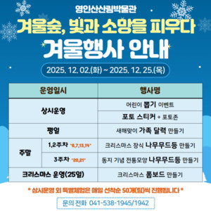 [충남타임즈] 아산시시설관리공단 영인산산림박물관이 올겨울 시민들에게 따뜻한 연말의 기억을 선물한다. 공단은 오는 12월 2일부터 25일까지 ‘겨울숲, 빛과 소망을 피우다’라는 이름으로 겨울 이벤트를 운영한다고 밝혔다.이번 행사는 한 해의 끝자락, 비교적 정적인 박물관 공간에 빛과 새해 소망을 담는 체험 요소를 더해 생동감을 불어넣겠다는 취지로 기획됐다. 가족 단위 관람객이 함께 참여할 수 있는 방식으로 준비되어 시민들의 참여 기대도 높다.체험 프로그램은 영인산산림박물관 로비와 전시실 일대에서 진행된다. 상설 운영되는 프로그램으로는
