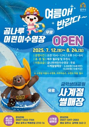 [충남타임즈] 공주시가 본격적인 무더위 속에서 어린이들을 위한 물놀이 공간을 전면 개방했다. 시는 여름철을 맞아 ‘곰나루 어린이수영장’과 ‘사계절썰매장’을 지난 주말부터 개장하고, 오는 8월 24일까지 금학생태공원과 곰나루관광단지 일원에서 운영한다고 밝혔다.운영 시간은 오전 10시부터 오후 6시까지로, 매주 월요일은 시설 정비와 위생 점검을 위해 정기 휴무일로 지정됐다. 기상 상황에 따라 현장 판단으로 임시 휴장도 가능하다.곰나루 어린이수영장과 어린이 물놀이장은 전면 무료 개방된다. 다만, 안전을 위해 중학생 이상은 이용이 제한되며