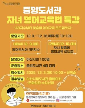 [충남타임즈] 아산시 중앙도서관은 오는 12월 9일과 16일, 두 차례에 걸쳐 영어교육 전문가 효린파파(성기홍)와 함께하는 자녀 영어교육법 특강을 운영한다.이번 특강은 자녀 영어교육의 핵심을 이해하고, 변화하는 교육환경에 적용할 수 있는 학습 방향을 제시하고자 마련됐다.1회차 강연은 영어 독서와 가독성 지수(AR지수)를 중심으로 읽기 경험의 중요성 및 독서 방법 등을 안내하고, 2회차 강연에서는 수많은 영어 교육 사례를 바탕으로 자녀 맞춤형 영어교육 로드맵을 위한 현실적인 학습 방향을 제시할 예정이다.성기홍 작가는 공교육 현장에서