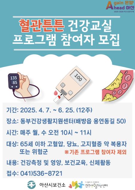 이번 강좌는 4월 둘째주부터 6월까지 주 2회(월, 수) 총 12주간 진행되며, 배방·탕정·음봉에 거주하는 고혈압 당뇨 고지혈증약 복용자와 건강 위험 요인 1개 이상(혈압·혈당·중성지방·HDL·복부둘레)인 자를 대상으로 한다.
