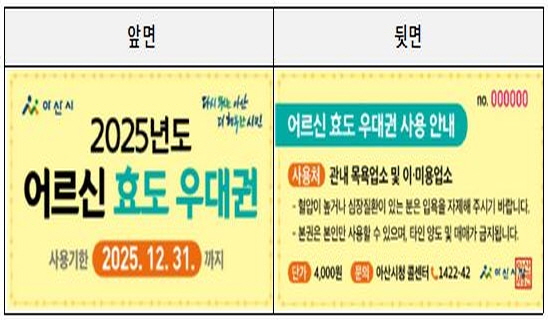 시는 대상 어르신에게 1인당 4천 원권 10매, 총 4만 원 상당의 효도우대권을 지급할 예정이다. 효도우대권은 아산시 관내 지정된 목욕탕이나 이·미용업소 등에서 사용할 수 있다.