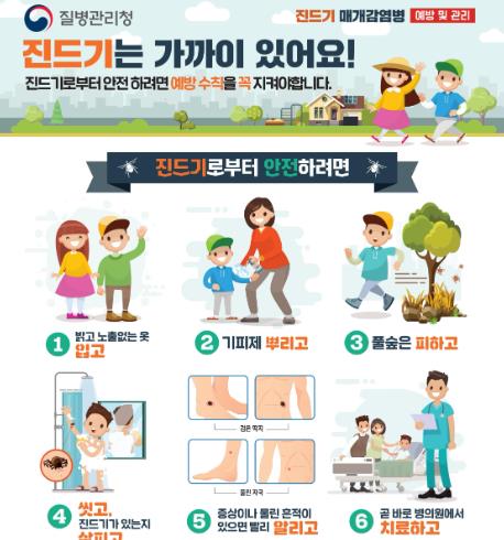 진드기 매개 감염병 예방을 위해서는 △야외활동 전 밝은 색 긴 팔, 긴 바지, 모자, 양말, 신발 등 노출을 최소화할 수 있는 복장 갖춰 입기 △진드기 기피제 사용하기(사용하는 기피제의 지속시간 확인하기) △야외활동 중 풀밭에 앉을 때 돗자리 사용하기 △풀밭에 옷 벗어놓지 않기 △야외활동 후 옷은 털어서 세탁하기 등과 같은 수칙을 준수해야 한다.
